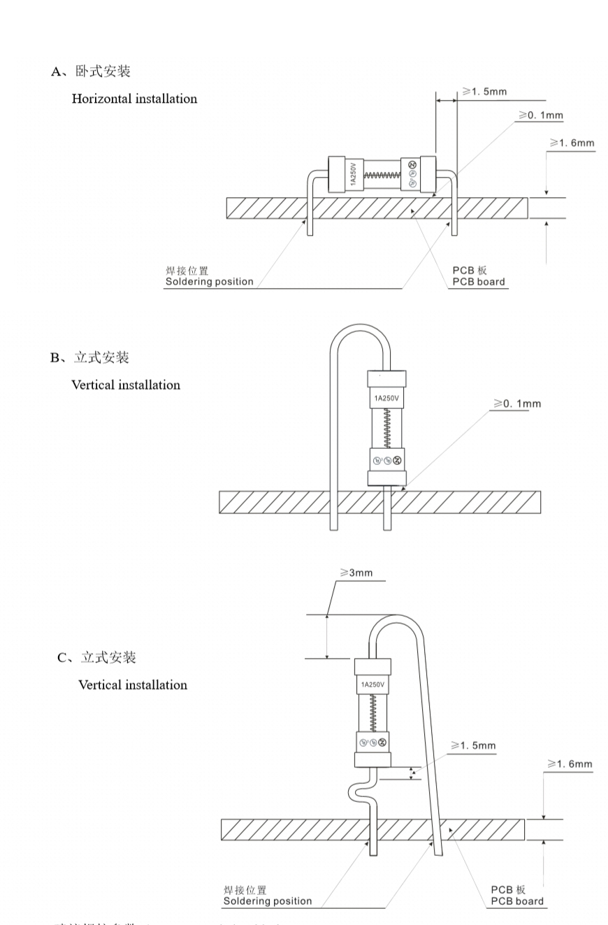 3.6*10的1A玻璃管保險絲的安裝方式有三種,一種是臥式安裝,另外一種是立式安裝,立式安裝有兩種,詳細安裝視圖如下圖所示: