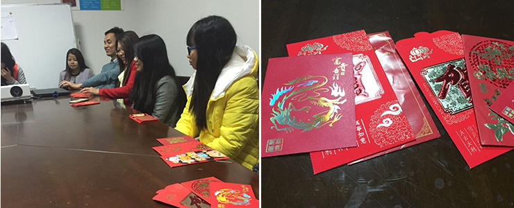 此時,老板笑著說:“還以為大家忘記了,哈哈,要是沒人提我就不發(fā)了。”說完便拿出預(yù)先準備好的紅包派發(fā)給大家,由大家一次抽簽,每個紅包大小金額不等。(推薦閱讀:集電通2016春節(jié)放假通知)